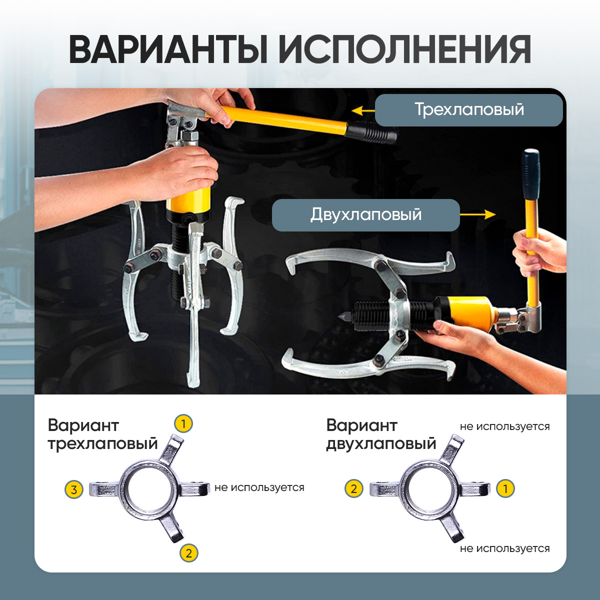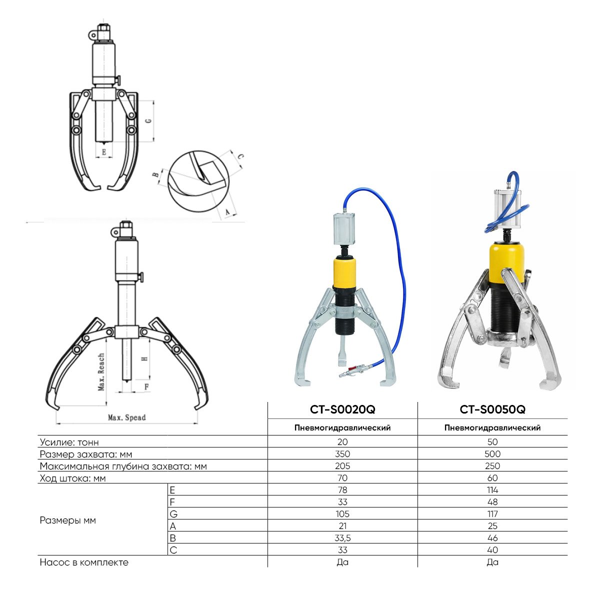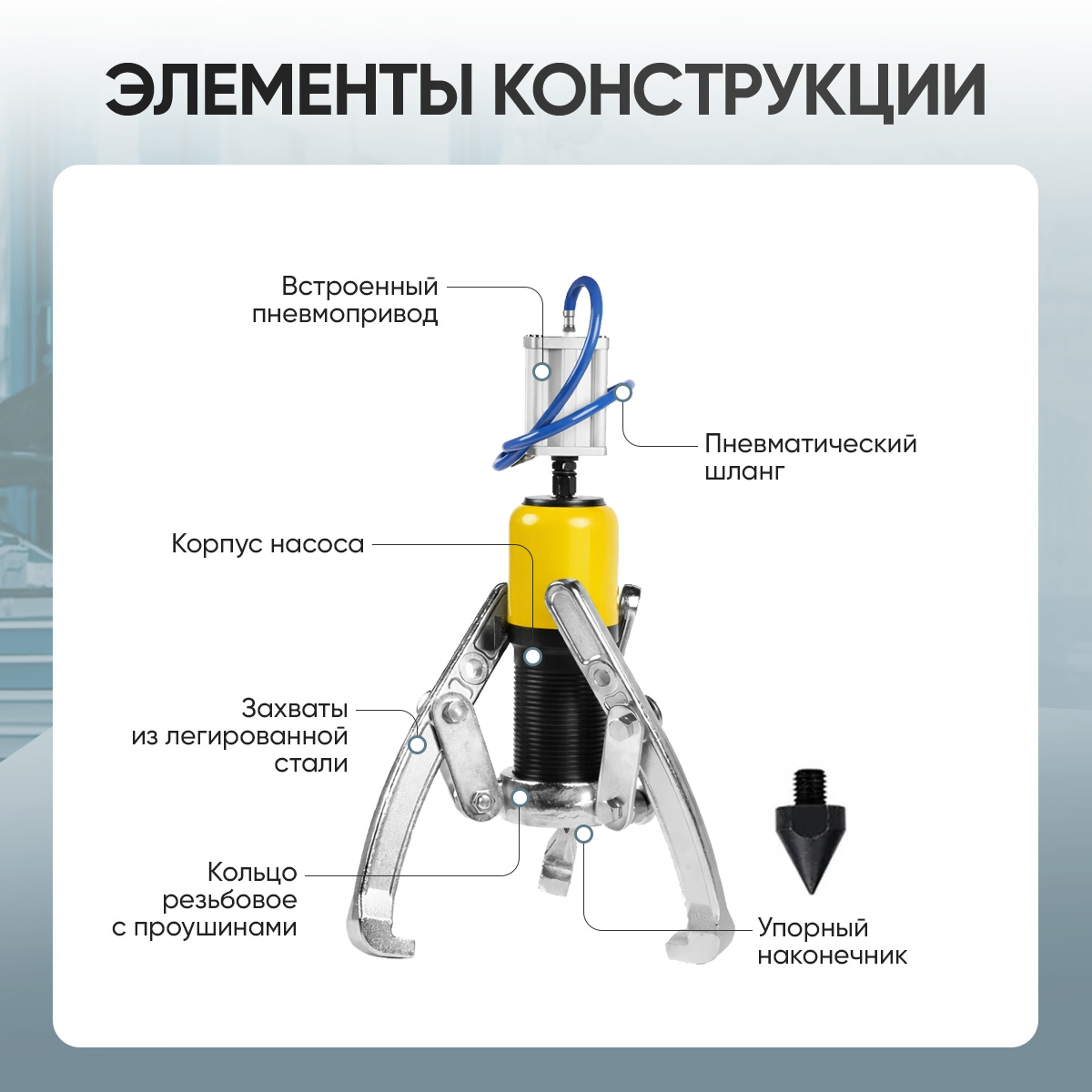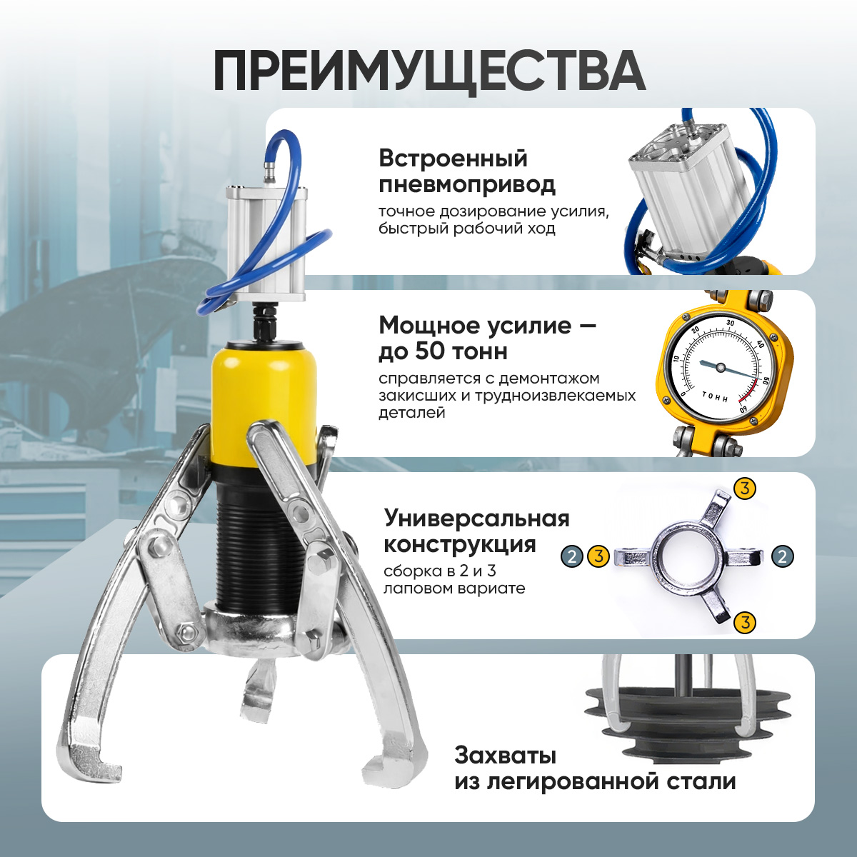 Профессиональный пневмогидравлический съёмник для быстрого и безопасного снятия зубчатых колёс, подшипников, втулок, шкивов и других запрессованных деталей. Работает в конфигурации 2-х или 3-х захватов, что позволяет гибко подстраиваться под узел. Кованая сталь захватов и рамы рассчитаны на долгий ресурс при регулярной эксплуатации. Пневмопривод разгружает оператора и делает процесс управляемым одним человеком.