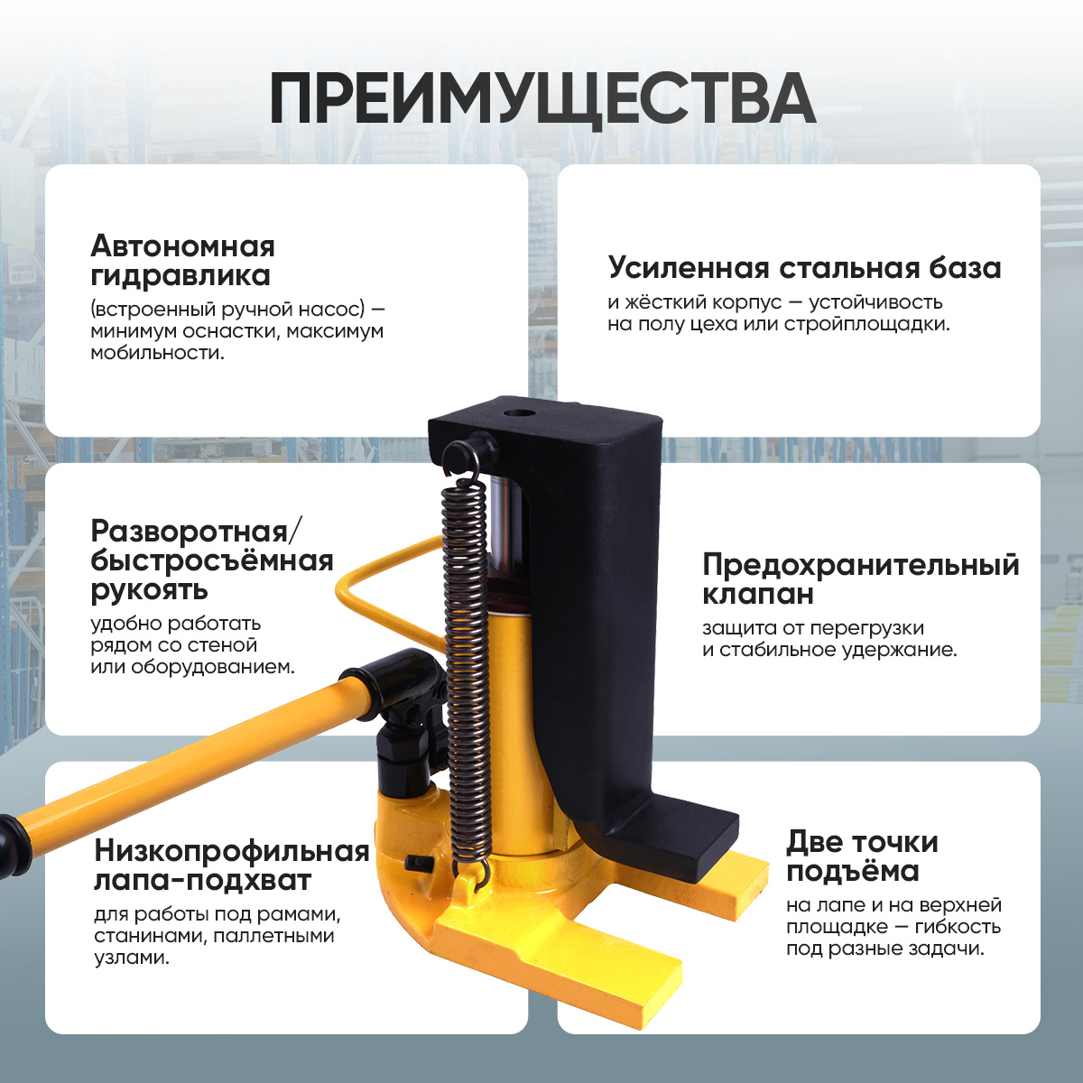 - Тип: гидравлический домкрат «зацепной» (с низким подхватом), автономный (встроенный ручной насос)
