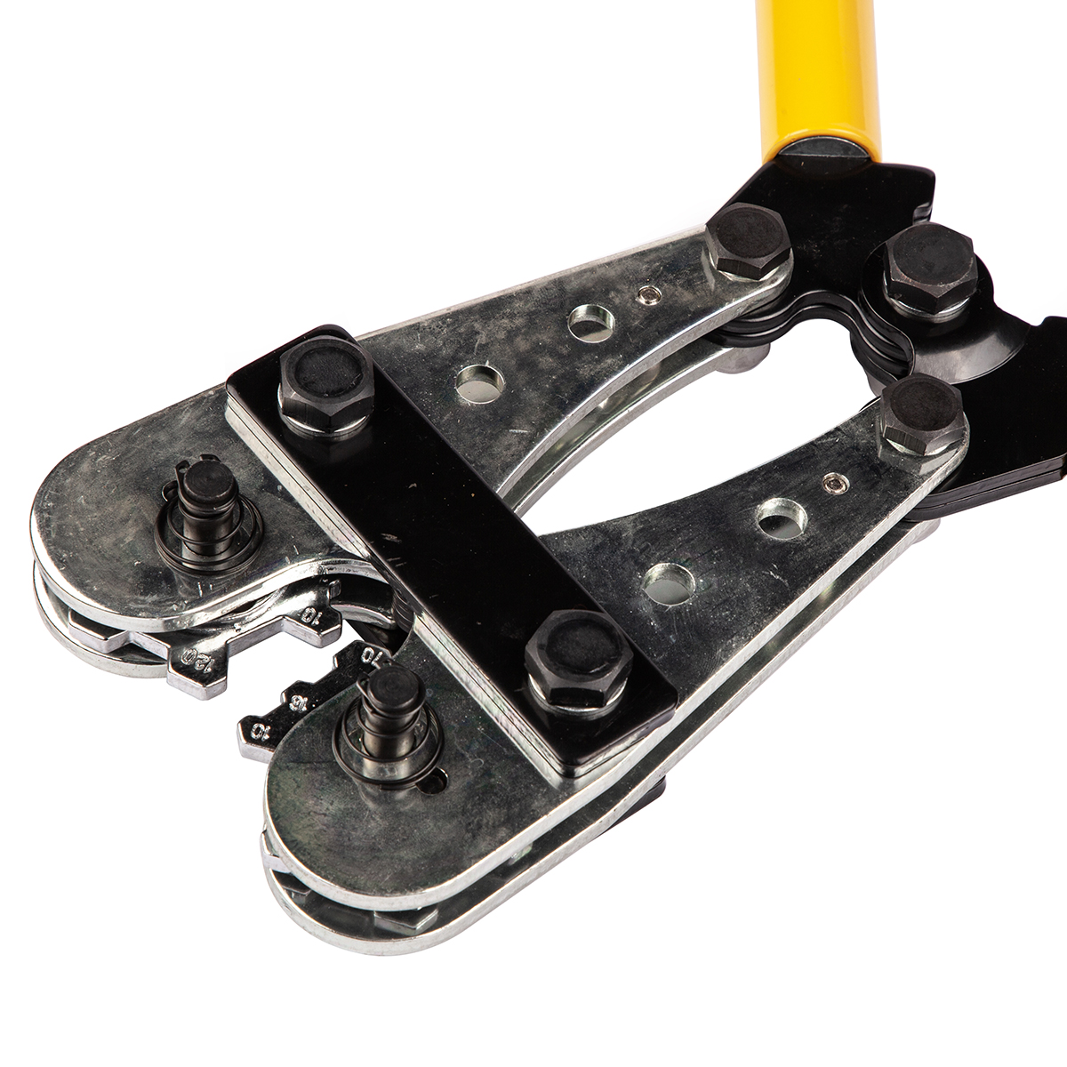 - Один инструмент вместо шести. Поворотный барабан губок быстро переключает размеры 16, 25, 35, 50, 70, 95, 120 мм² — не нужно таскать комплект отдельных клещей.