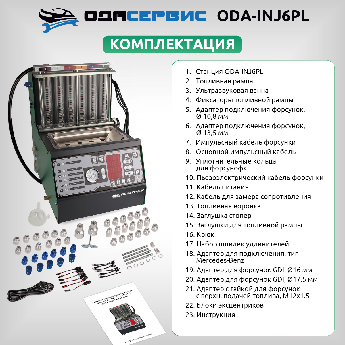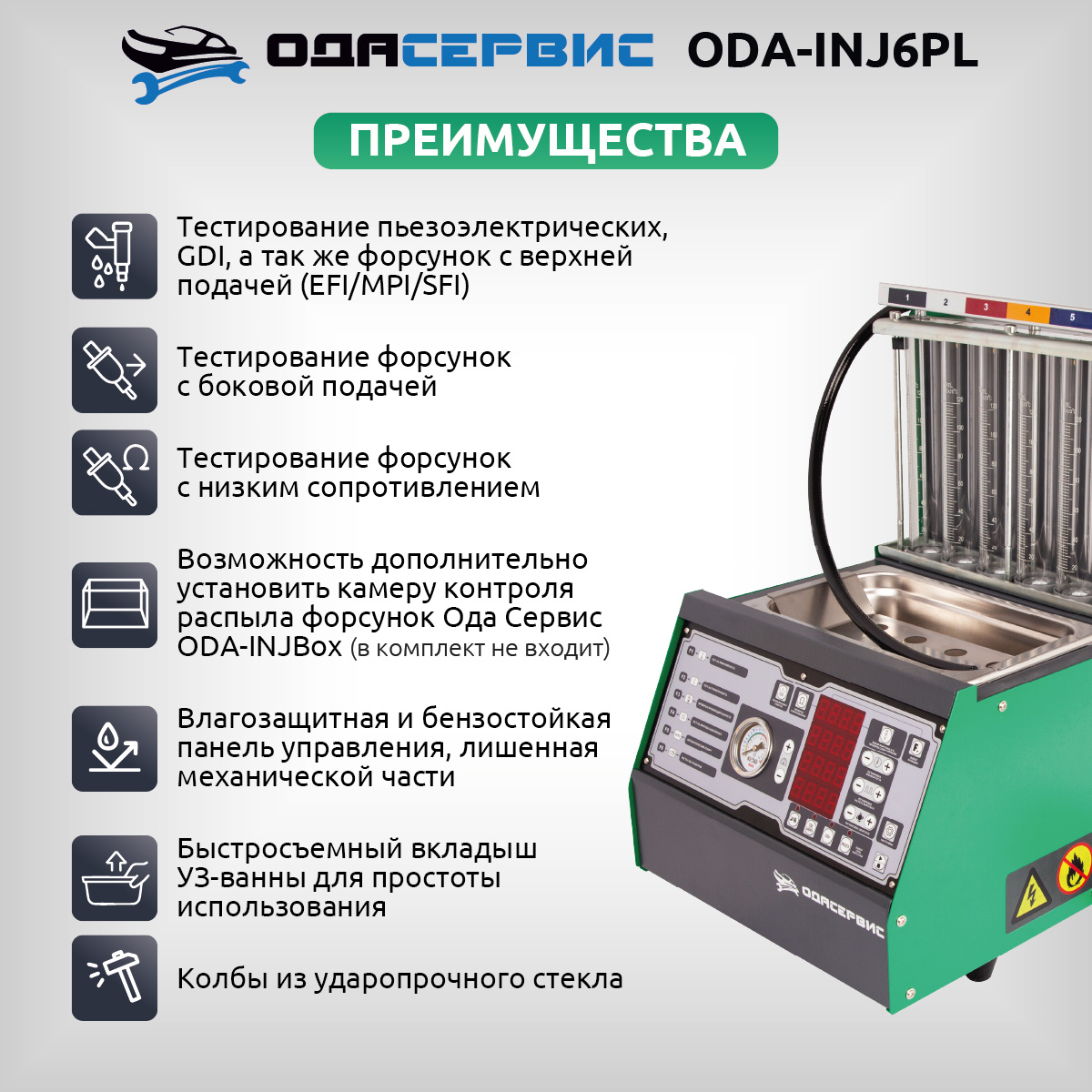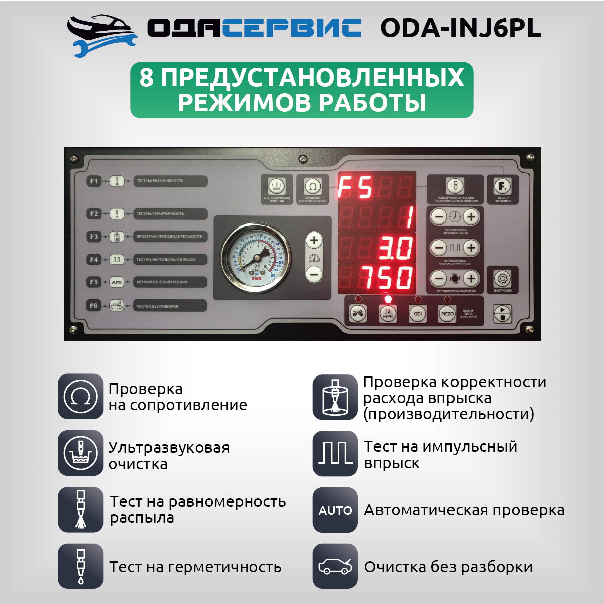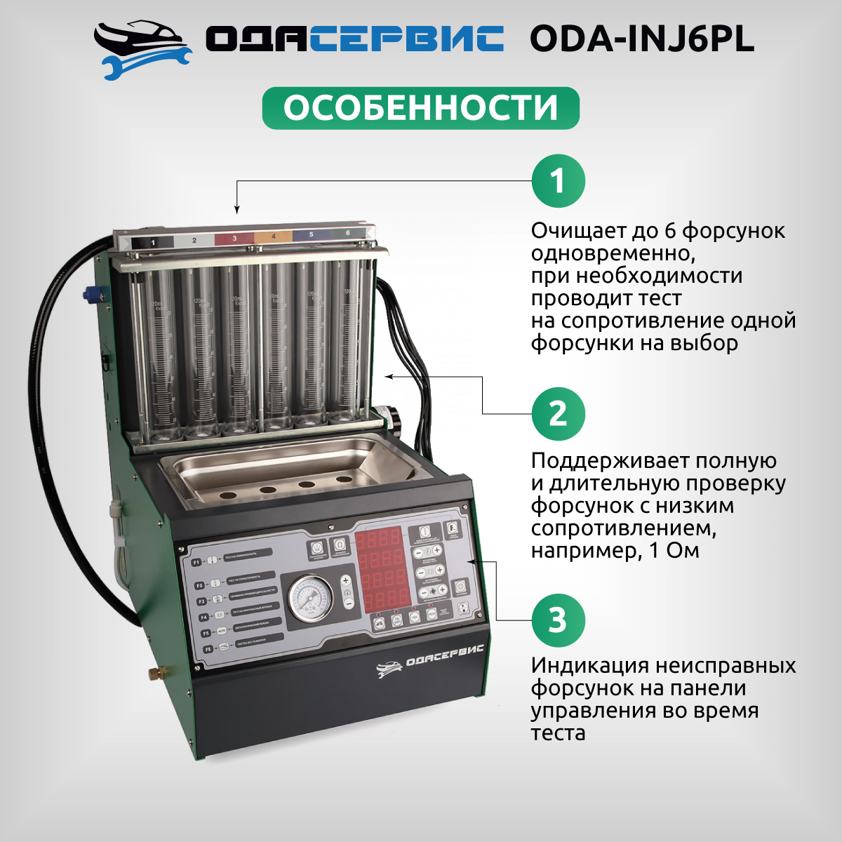 Новейшая модель в линейке стендов ODA-INJ6PL для тестирования и ультразвуковой очистки бензиновых форсунок от компании ОДА Сервис. Стенд позволит выявить и устранить практически все неисправности форсунок, связанные с загрязнением, отложениями и неисправностями в обмотке. С его помощью вы сможете смоделировать работу форсунок на автомобиле, проверить их герметичность, сопротивление и т.п. Отличительной чертой стенда является тестирование форсунок Piezo и GDI, а также тест сопротивления форсунок.