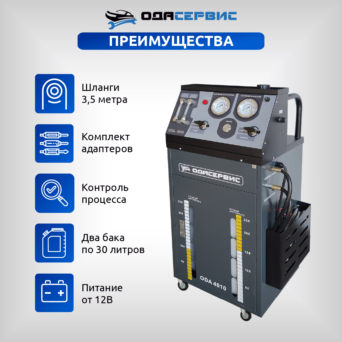 Установка для замены антифриза ODA-4010 станет отличным решением для автосервисов, станций технического обслуживания (СТО), дилерских центров и сервисных мастерских.