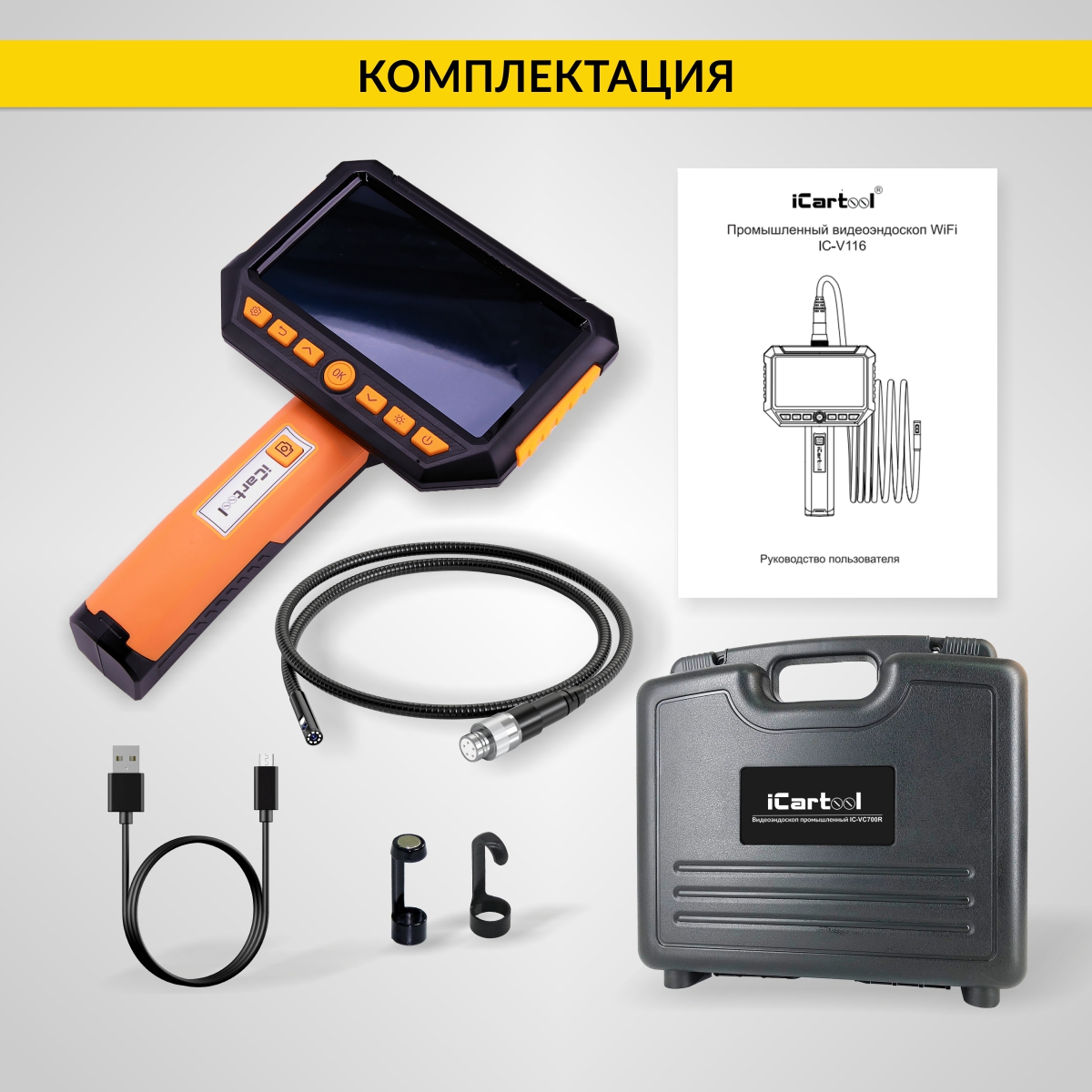Видеоэндоскоп промышленный с 2 камерами, 4.3", 2Мп, 1м, 5.5 мм карта 16ГБ iCartool IC-V112B