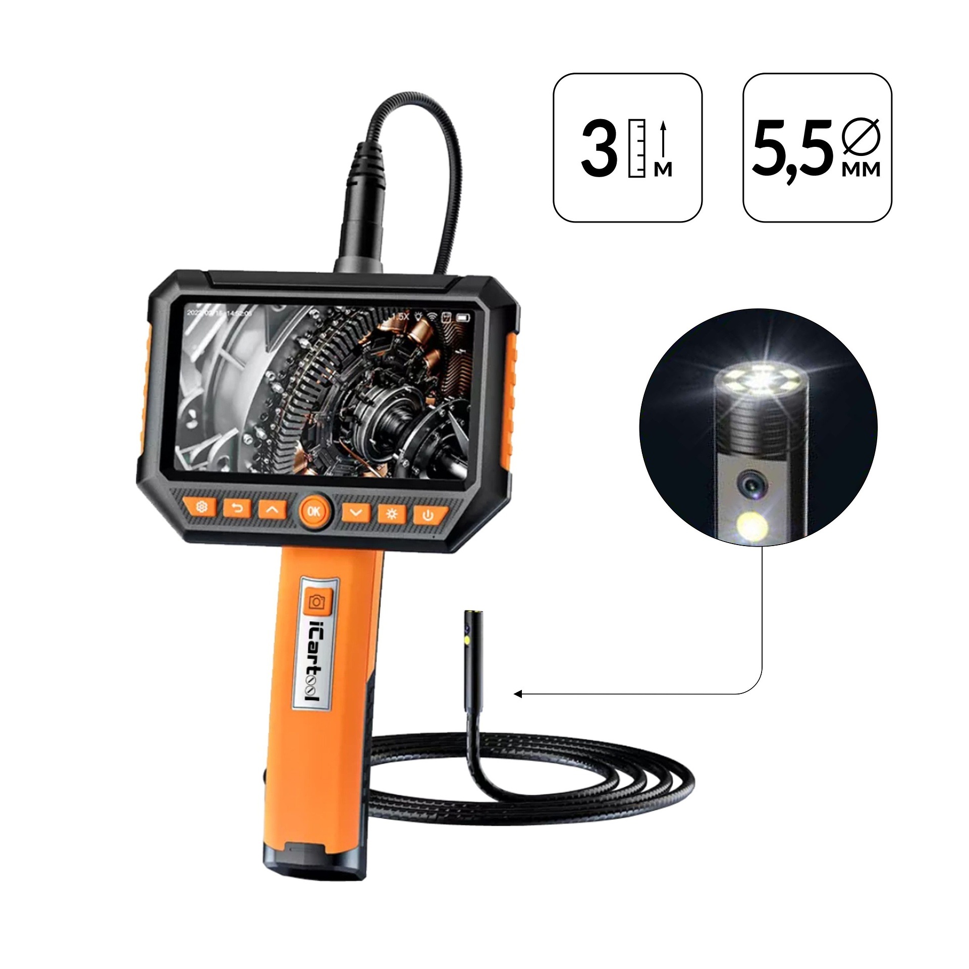 Видеоэндоскоп промышленный, экран 5", 2 камеры, 2Мп, 1920х1080, 3м, 5.5 мм сменный зонд iCartool IC-V116B-3