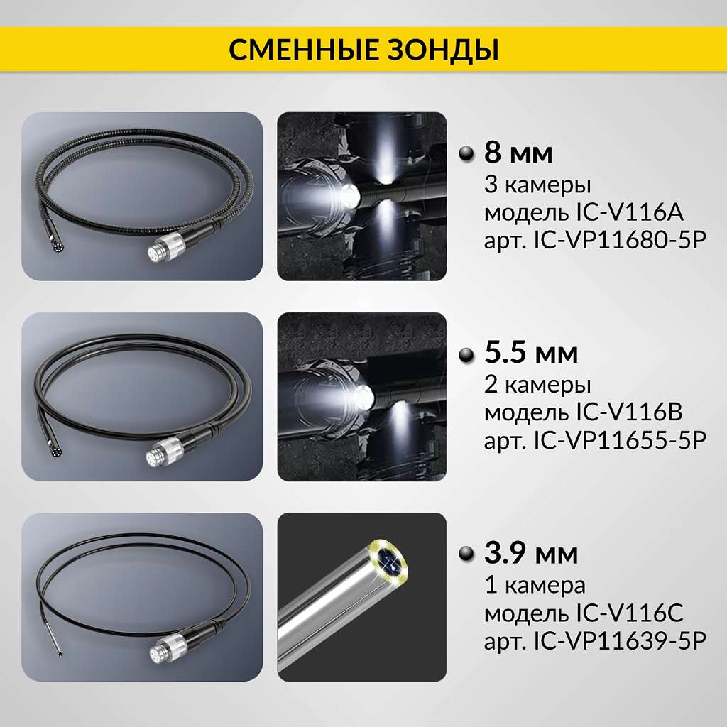 Зонд для видеоэндоскопа iCartool IC-V116A, 3 камеры, 1м, 8 мм iCartool IC-VP11680-5P