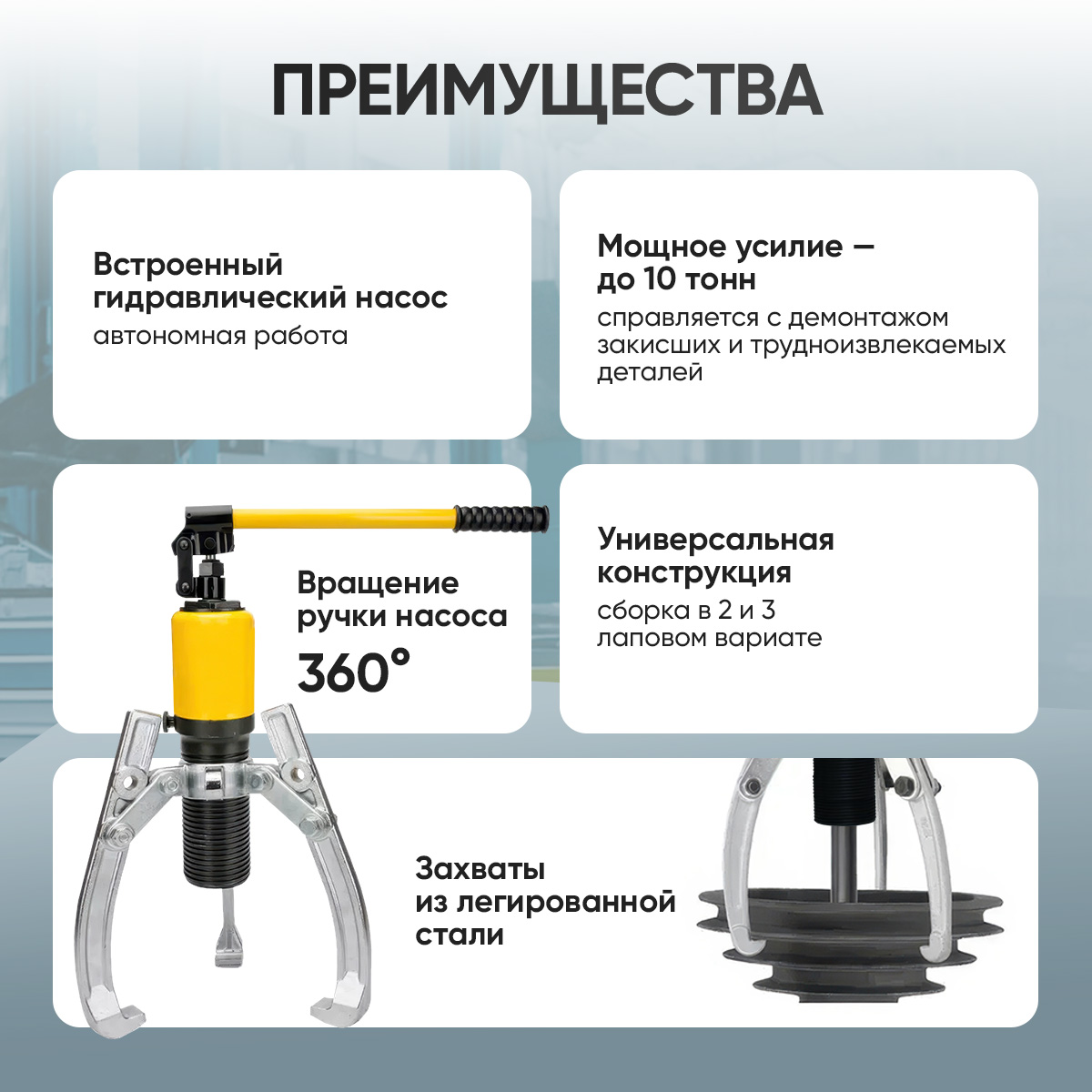 - Выносной гидравлический насос: повышает мобильность и удобство работы, позволяет использовать съёмник в ограниченном пространстве
