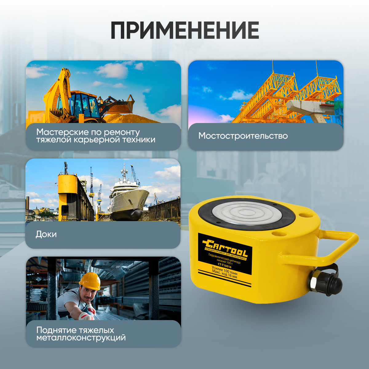 - Выдерживает колоссальные нагрузки. 100 т усилия — справится даже с крупной спецтехникой и массивными конструкциями.