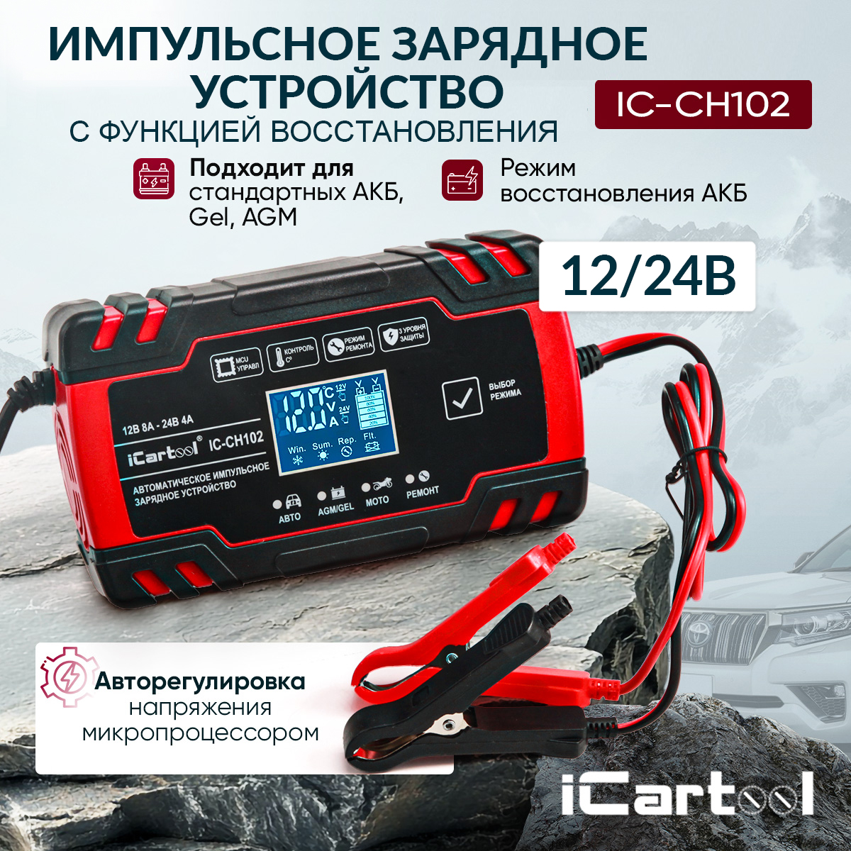 Автоматическое импульсное устройство 2 в 1 iCartool IC-CH102 предназначено для заряда и восстановления всех типов свинцово-кислотных аккумуляторных батарей (АКБ) 12В/24В, включая АКБ типов AGM/GEL.