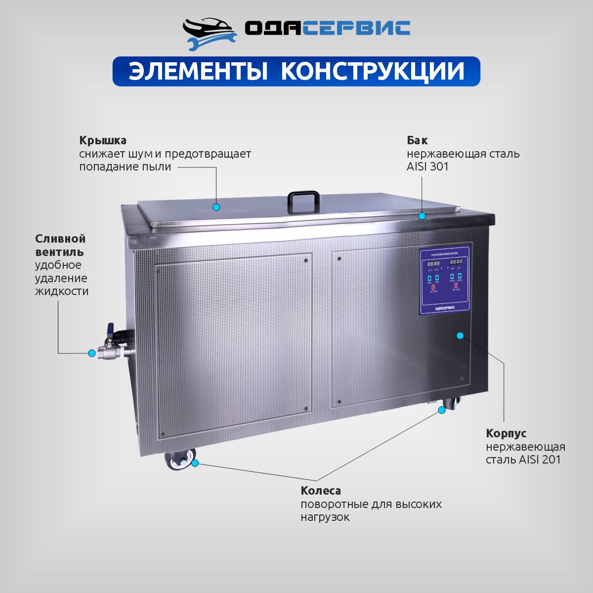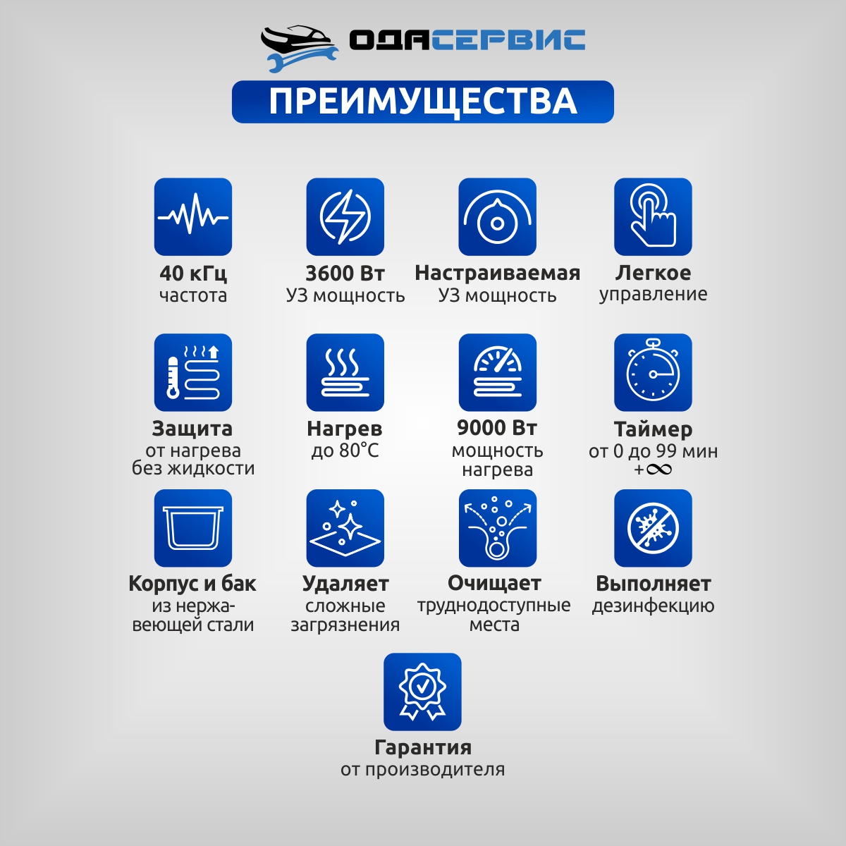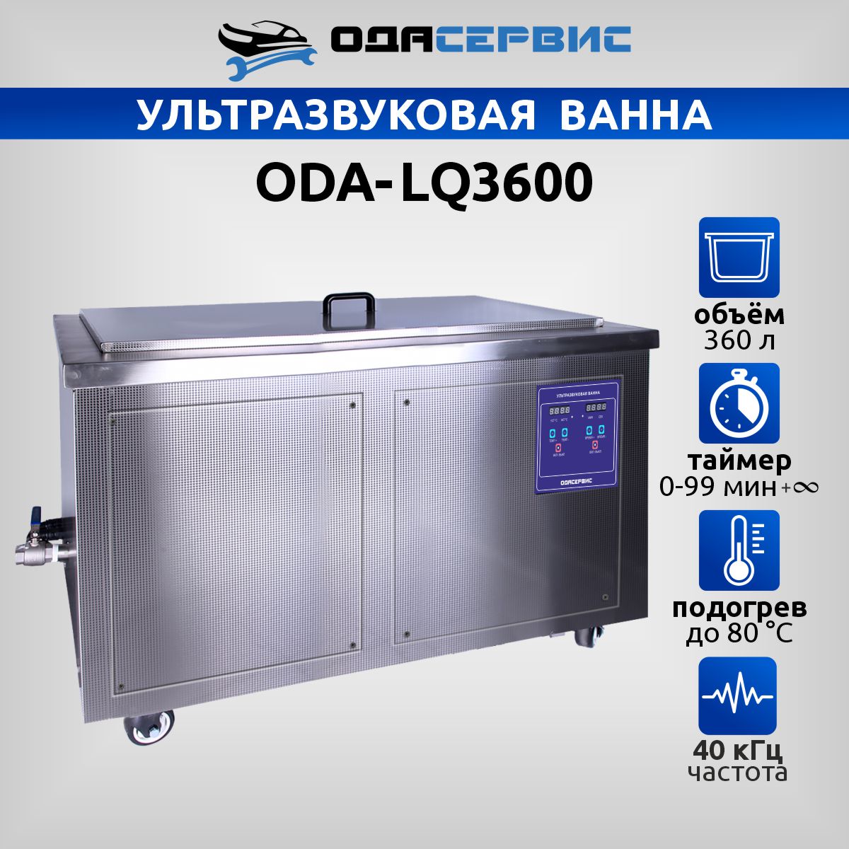 ОДА Сервис ODA-LQ3600 — это промышленная ультразвуковая ванна на 360 литров с регулировкой мощности ультразвука, электронным таймером и подогревом. Такие ванны имеют широкий спектр применения, от мойки крупных и не очень деталей в автосервисе, до использования на производстве.
