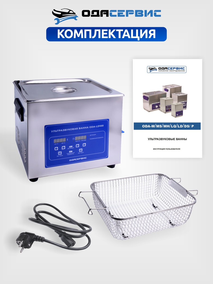 ODA-LD100 – ультразвуковая ванна объемом 10 литров с электронным управлением, дегазацией и выбором мощности ультразвука, 50 или 100%. Оснащена таймером до 30 минут и подогревом до 80°С. Ванна и корзина сделаны из нержавеющей стали SUS304. Имеет частоту ультразвука 40кГц. Подходит для очистки маслянистых, смолистых, жировых и карбоновых отложений. Также возможно использование для стерилизации различных предметов.