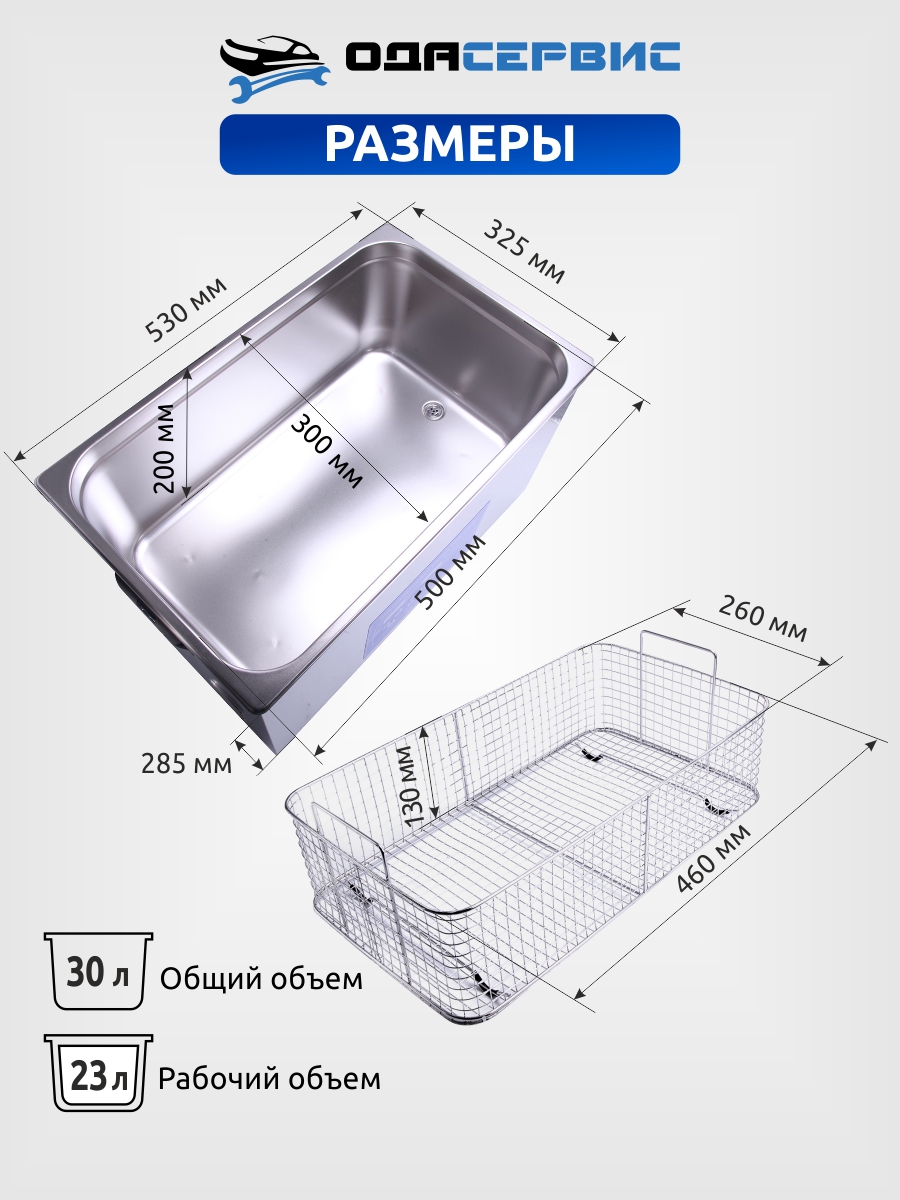 *Обратите внимание: объем ванны указанный в Наименовании, заводом изготовителем, рассчитывается по формуле ДхШхГ, где Д (длина) и Ш (ширина) измеряются по верхней внутренней границе бака, Г ( глубина) максимальное расстояние от верхней кромки бака до его дна. Реальный объем ванны в литрах, отличаться от заявленного, т.к. конструкция бака конусообразная. При выборе ультразвуковой ванны ориентируйтесь на ее рабочий объем.